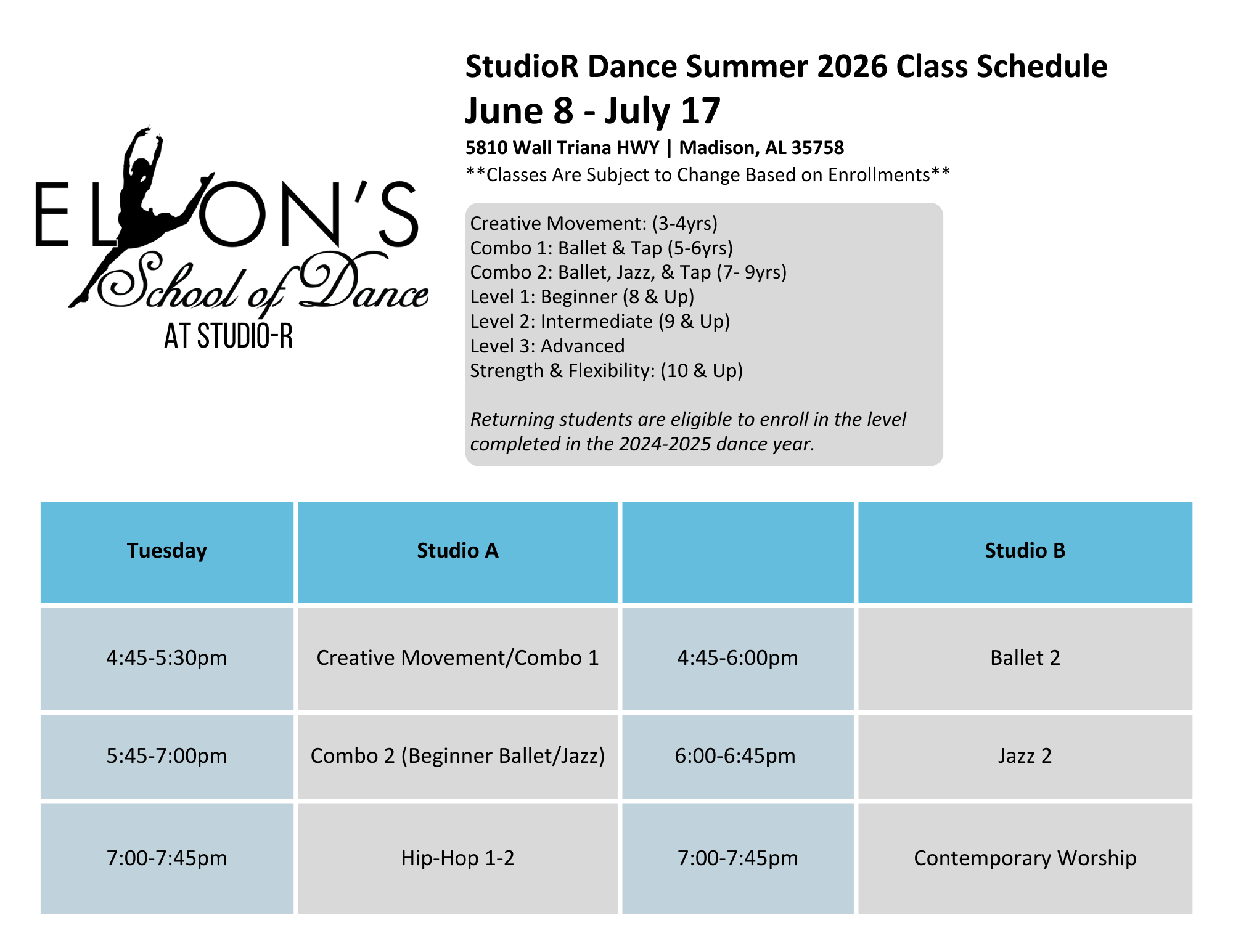 Classes and Room Assignments are subject to change based on Enrollments